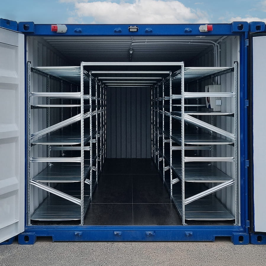 Dzięki zabudowie regałowej kontener budowlany lub kontener morski staje się uporządkowaną, bezpieczną i łatwą w użytkowaniu przestrzenią magazynową.